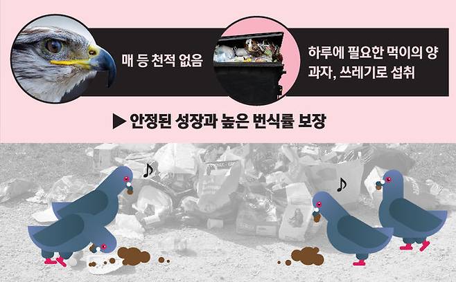 도시에는 비둘기의 천적인 매 등이 서식하지 않는 데다 먹이도 풍부합니다. 시민이 던져주는 음식이나 여기저기 널린 쓰레기로 비둘기는 하루에 필요한 먹이의 양을 쉽게 채울 수 있습니다. 천적 없는 환경과 풍부한 먹이가 비둘기의 성장과 높은 번식률을 보장해 주는 셈입니다.