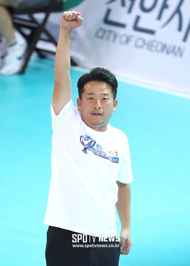 [스포티비뉴스=천안, 곽혜미 기자] 2017년 KOVO컵 천안·넵스 컵 프로배구대회 남자부 우리카드와 KB손해보험의 경기가 14일 오후 충남 천안 유관순체육관에서 열렸다. 개그맨 김준호가 시구를 마친 후 세리머니를 하고 있다.