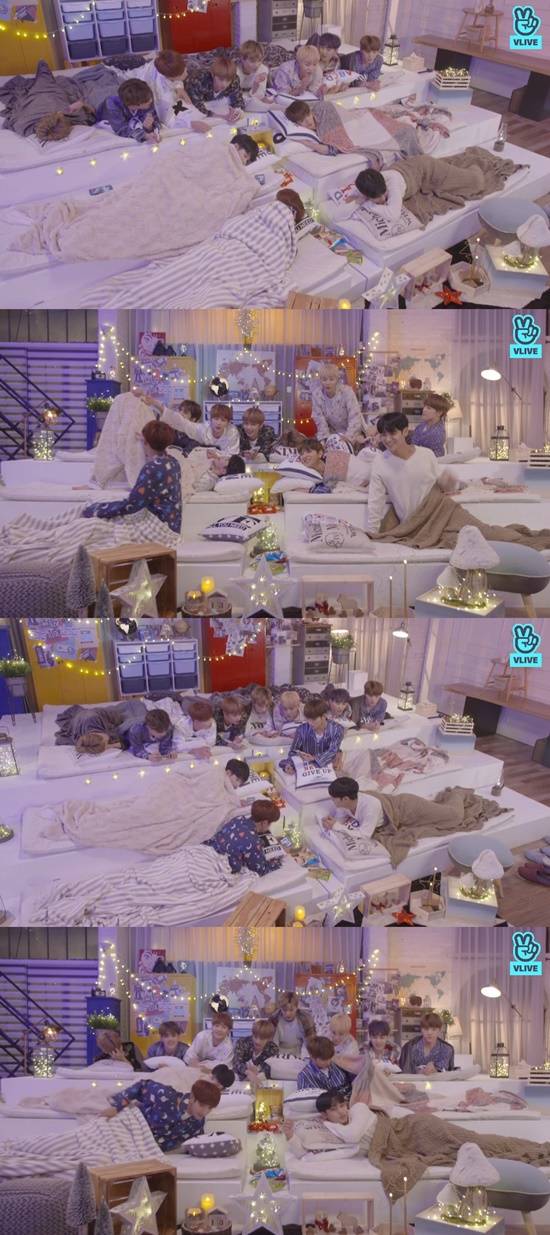 13일 방송된 네이버 V라이브 '세븐틴의 눕방라이브!'에서는 디에잇을 제외한 그룹 세븐틴(에스쿱스, 정한, 조슈아, 준, 호시, 원우, 우지, 디에잇, 민규, 도겸, 승관, 버논, 디노)이 12명이 출연해 이야기를 나눴다.