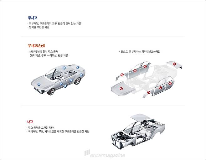 빈번히 일어나는 도로 위 자동차 사고에 비해 막상 중고차를 구입하려고 하면 사고로 분류된 차는 그리 많지 않다. 때문에 중고차를 구입하려고 마음먹은 소비자들은 메리트는 둘째치고 '정말로 믿을 수 있는 자동차인가?'에 대해 관심이 높다. 과거에 비해 많이 정화되었다고는 하지만 '사고차', '무사고차', 사고 부위에 대한 의심은 여전히 지울 수 없는게 현실. 과연, 법에서 정한 무사고 중고차 중에서 일반 소비자들이 생각하는 무사고차는 얼마나 차지하고 있을까?