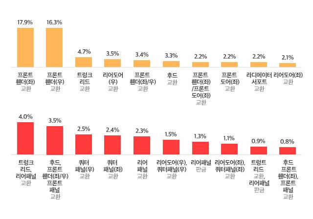 추가로 어느 부분의 수리가 가장 많이 되었는지 확인했다. 손상의 이력이 있는 무사고 자동차를 100으로 두고 보았을 때, 사고가 빈번한 부위별 조합은 전체 좌측 프론트 펜더(17.9%)나 우측 프론트 펜더(16.3%) 한 쪽을 교환한 경우가 가장 많았다. 그 다음은 자동차 뒤쪽에 해당하는 트렁크 리드(4.7%)와 오른쪽 리어도어(3.5%)였다. 쉽게 접근해 보면 뒤쪽은 다른 차의 잘못일 가능성이 크고, 앞쪽은 운전자뿐만 아니라 다른 차의 과실로도 일어날 수 있는 사고다.