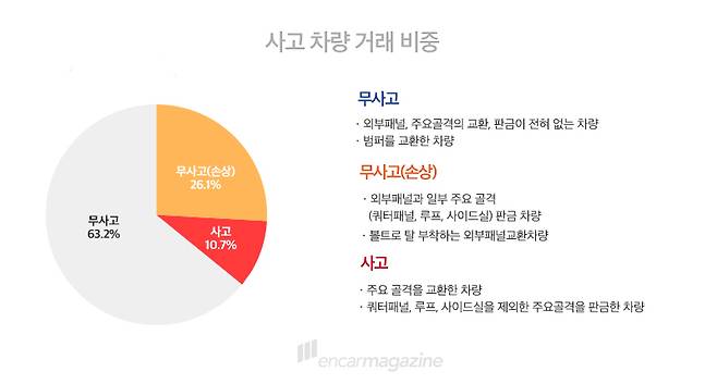 전체의 26.1%는 무사고라 하더라도 외부패널 하나 정도는 판금이 표시된 자동차다. 무사고 자동차로 분류됐지만 일반적인 관점에서 실제로 작은 사고라도 발생한 26.1%까지 포함하면 '사고차'의 비율은 10.7%에서 36.8%까지 늘어난다.