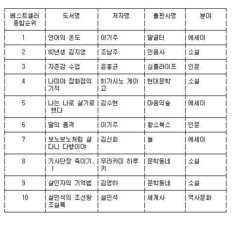 소설은 종합 순위 100위권에서 25종이 포함됐다. '82년생 김지영'을 필두로 김영하의 '살인자의 기억법'·'오직 두 사람', 무라카미 하루키의 '기사단장 죽이기' 등이 인기를 끌었다.
