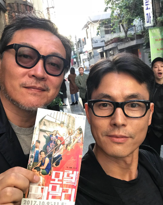 정우성과 김의성은 연극 '모럴 패밀리'의 팜플렛을 들고 카메라를 바라보고 있다. 연극 '모럴 패밀리'는 배우 김선영의 남편인 이승원 감독이 연출을 맡은 작품이다.