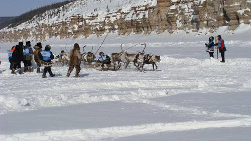 | 겨울철 꽁꽁 얼어붙은 레나강에서 시베리아 소수민족 중 한 종족인 에벤키인들은 매년 개최하는 축제의 하이라이트로 순록썰매경주를 한다. |