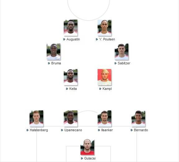 라이프치히는 이 경기에서 간판 공격수 티모 베르너가 순환 장애로 인해 벤치에서 대기한 가운데 유수프 포울센과 장-케빈 오귀스탱이 투톱으로 나섰다. 이에 더해 하젠휘틀 감독은 에이스 에밀 포르스베리 대신 브루마를, 주장 빌리 오르반 대신 슈테판 일잔커를, 그리고 수비형 미드필더 디에고 뎀메 대신 케빈 캄플을 선발 출전시켰다.