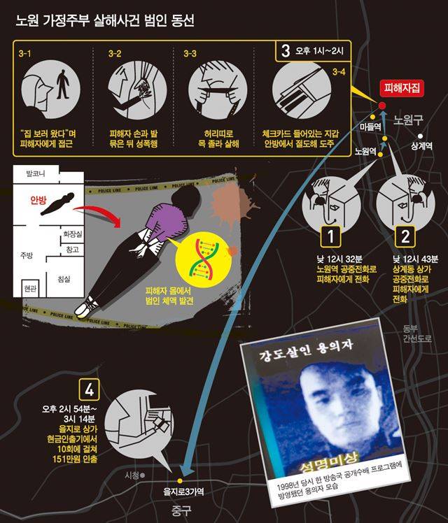 통화기록 추적 등 추가 수사가 진행됐다. 피해자는 사건 당일 낮 12시32분과 43분, 누군가와 두 차례 연이어 통화했다. 공교롭게 모두 공중전화. 먼저 온 전화의 발신지는 지하철4호선 노원역 2층이었고, 다음 전화는 노원역과 이씨 아파트 중간 지점에 있는 상가에서 걸려왔다. 시간 흐름과 동선을 유추해볼 때, 동일인물일 가능성이 컸다. ‘신원을 드러내지 않기 위해 일부러 공중전화를 이용. 오후 1시쯤 피해자 집에 도착해 어떤 이유로 몸싸움을 벌이다 몸을 묶고 성폭행한 뒤 살해하는데 1시간 정도. 택시를 타고 을지로로 가서 오후 3시쯤 돈을 인출. 그리고 잠적.’ 경찰 머리 속에 퍼즐이 조금씩 맞춰져 가고 있었다.