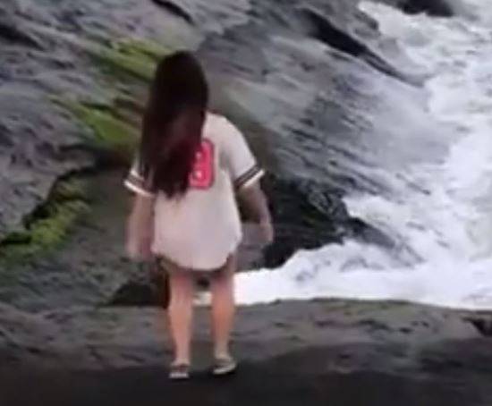영상에는 파도치는 바다를 배경으로 사진을 찍기 위해 미끄러운 바위로 올라서고 있는 여성의 뒷모습이 담겨있다.