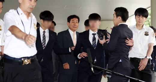 원세훈 전 원장은 30일 오후 서울 서초구 서울고등법원에서 열린 파기환송심 선고공판에 출석하면서 경호원들에 둘러싸여 있었다.