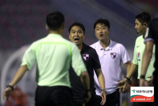 부산은 10일 수원종합운동장에서 열린 수원FC와의 2017년 KEB하나은행 K리그 챌린지 20라운드에서 0대1로 패했다. 연승이 두 경기에서 멈춘 부산(승점 38)은 2위를 지켰지만 이날 역시 패한 선두 경남(승점 42)과의 승점차를 줄이지 못했다. 특히 후반 추가시간 김진규의 슈팅이 수원FC 골망을 흔들었지만 오프사이드로 판정됐다. 조 감독은 이 부분에 불만을 갖고 있는 듯 했다.