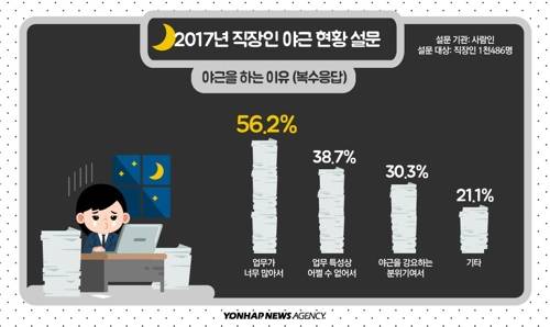 야근 이유는 '업무가 많아서(56.2%, 복수응답)'가 가장 많았다. '업무 특성상 어쩔 수 없어서(38.7%)', '야근을 강요하는 분위기(30.3%)' 때문이라는 이들도 상당했다.