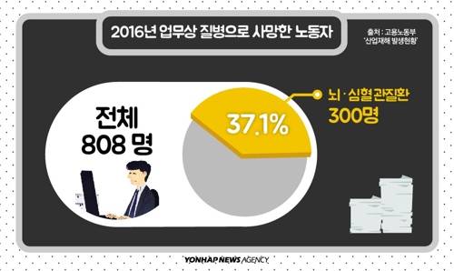 지난해 산업재해 통계를 살펴보면 과로사의 대표적 유형인 뇌·심혈관질환으로 사망한 노동자는 약 300명. 업무상 질병으로 사망한 노동자(808명)의 37.1%에 달한다.