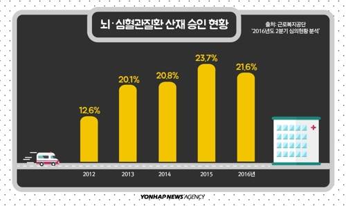 근로복지공단의 '2016년도 2분기 심의현황 분석'에 따르면 뇌·심혈관질환의 산재 승인율은 2012년 12.5%, 2013년 2.1%, 2014년 20.8%, 2015년 23.7%, 2016년 21.6%에 불과했다.