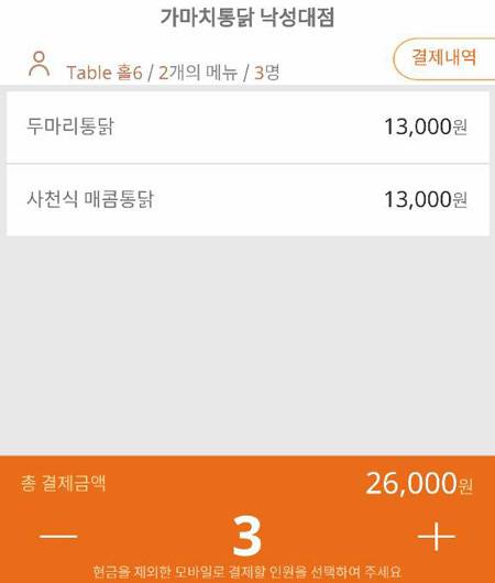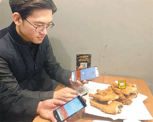 21일 오후 서울 관악구의 한 프랜차이즈 치킨집. ‘두 마리 통닭’과 ‘사천식 매콤통닭’을 시켰더니 주문서에 2만6000원이 찍혔다. 기자와 일행 2명은 네이버에 들어가 주문서에 있는 QR코드를 찍었다. 그리고 각자 8670원씩 계산했다. 더치페이로 결제를 끝내는 데까지 1분도 걸리지 않았다.