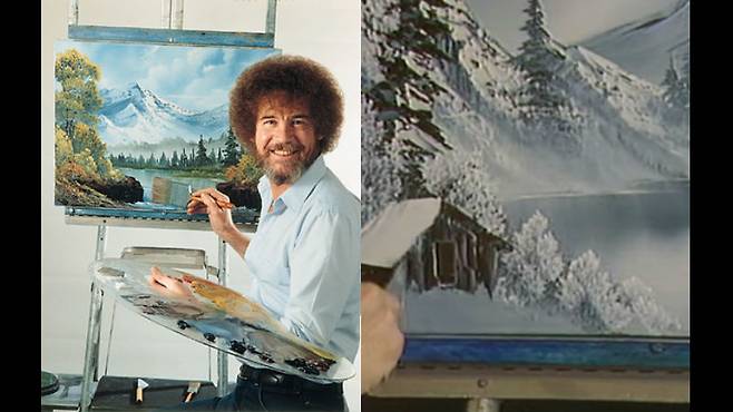 밥 로스 씨는 마르지 않은 물감 위에 다시 물감을 덧칠하는 기법(wet-on-wet)으로 유화를 그려 큰 인기를 얻었습니다.