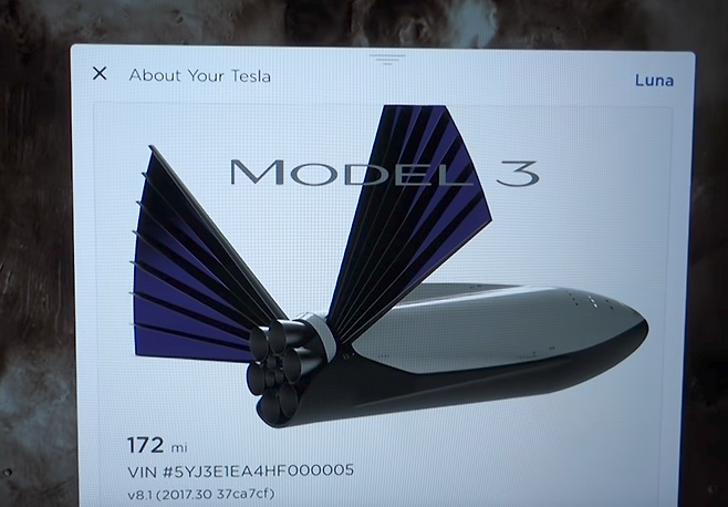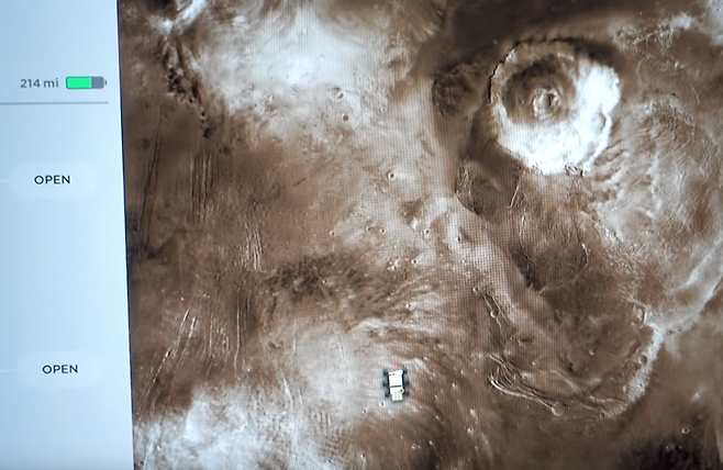테슬라 모델 3의 인포테인먼트 화면에서 'About your Tesla' 누르면 자신의 차량 정보가 표현된다. 여기서 메뉴를 양측으로 갈로 질러 터치하면 밝게 빛나는 반짝임이 화면을 떠다닌다. 이때, 화성 모양의 아이콘을 터치하면 화면에 있어야 할 도로가 화성 표면으로 바뀐다.