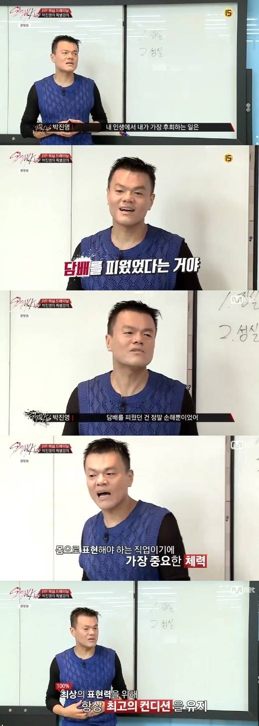 특히 박진영은 "두 번째는 성실이다. 내가 제일 후회하는 일은 담배를 피웠다는 거다. 담배를 피웠던 건 정말 손해밖에 남지 않았다. 춤을 정말 잘 추고 싶었다. 우리는 몸으로 표현해야 한다. 몸이 최상의 상태가 아니면 표현할 방법이 없다. 그래서 몸 관리를 잘 해야 한다"라고 경고했다.