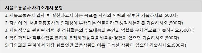 자소서 2번 항목 : 공사의 인재상이 자신과 어떤 식으로 매칭되는지를 써야 한다. 말하자면 자신이 왜 공사에 잘 맞는 사람인지, 설득해보라는 것인데, 문제는 홈페이지에 들어가보면 도무지 인재상을 알아보기 힘들게 되어 있다는 것이다. “서울교통공사는 열정과 도전정신을 가진 인재를 환영합니다.”라는 한 마디 말이 인재상의 전부라면 너무 성의가 없는 것이고, 핵심가치라고 해서 업무자세 가치 Input, 업무수행 가치 Throughput, 최종산출 가치 Output이라고 쓰여진 것이 인재상과 연관된 것인지 홈페이지 구성만 가지고 알기는 힘들다. 그리고 이게 인재상이면 이게 도대체 무슨 뜻인지에 대한 설명이 없다. 슬로건으로 제시된 최고추구, 미래도전, 약속이행, 행복나눔, 무한안전과는 어떤 관계인지도 명확치 않다. 통합이 되어서 정리하는 단계인 건 알겠는데, 인재상을 가지고 자소서를 쓰라고 했으면 그 부분에 대한 성의 있는 설명 정도는 되어 있어야 할 것이다. 아니면 인재상을 가지고 자소서 문항을 내지 말든지 말이다.