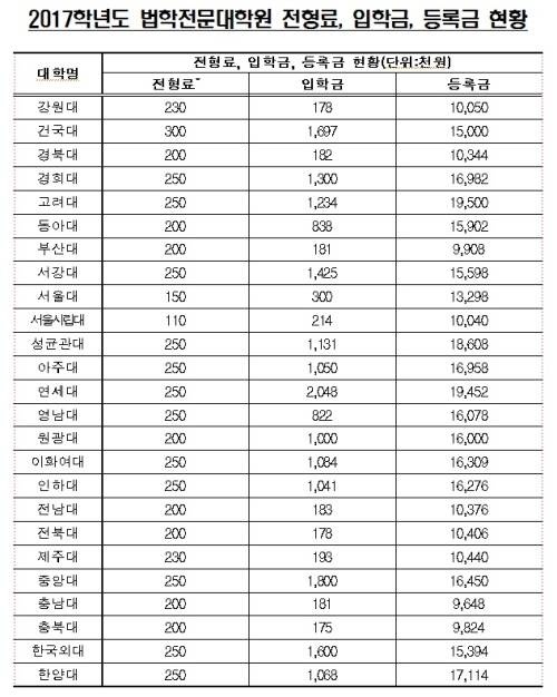낮은 국공립 로스쿨은 충남대(1002만9000원), 충북대(1019만9000원), 부산대(1028만9000원) 순이었다. 10개 국공립 로스쿨 학비 평균은 등록금 1043만3400원, 입학금 19만6500원, 전형료 19만2000원 등 1043만3000원이었다.