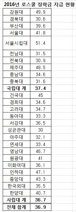 국공립이라고 해서 장학금을 많이 주는 것은 아니었다. 국공립 로스쿨의 지난해 평균 장학금 지급률은 37.4%로 서울시립대(51.4%), 강원대(49.9%), 제주대(48.5%), 서울대(41.8%), 부산대(39.6%) 순으로 많이 줬다. 장학금을 덜 준 로스쿨은 경북대(30.6%), 전북대(30.9%), 전남대(31.5%) 등이었다.