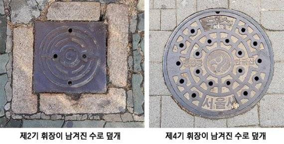 | ▲(왼) 경성부-서울시의 휘장(심벌마크)은 총 네 차례 바궜다. 이중 제2기 휘장이 남겨진 수로 덮개, (오) 현재 흔히 볼 수 있는 제4기 휘장이 남겨진 서울시 맨홀 |