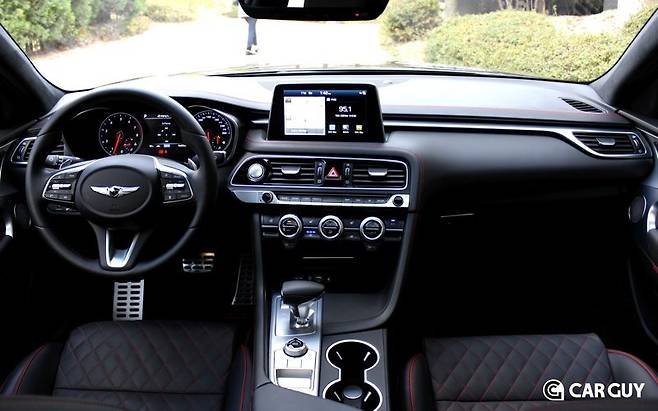 G70은 고급감에 초점을 맞춘 느낌이다. 우선 차량에 다가가면 제네시스 로고 모양의 웰컴 라이트가 반겨준다. 문을 열고 실내로 들어와서 느껴지는 감각이 정말로 고급스럽다. 대시보드를 이루는 거의 모든 부분을 가죽으로 마감했다. 좌석과 도어 패널에도 퀼팅을 했다. 프리미엄 차급에서나 볼 수 있는 고급감이다.