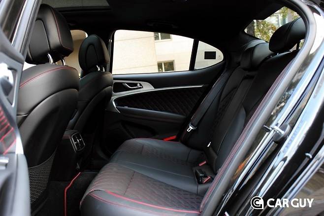 부족한 건 수납공간뿐만이 아니다. 스포티한 거동을 위해 차체 길이를 줄이는 바람에 뒷좌석 공간이 상상 이상으로 좁다. 무릎 공간은 사실상 아반떼만큼도 안 되는 것 같다. 사실상 체급으로 보면 G70은 아반떼 급인 준중형 크기다. 게다가 센터 터널로 인해 가운데 좌석은 거의 사용이 불가능하다. 또 쿠페형으로 루프라인을 깎으면서 머리 공간도 턱없이 작다. 캡 모자를 쓰고 뒷좌석에 앉으면 정수리가 아프다. 1열 시트 포지션을 낮춰 놓기까지 해서 뒷좌석 승객은 발 둘 공간조차 없다. 2열엔 몸집이 작은 어린이가 타는 게 고작일 것 같다.