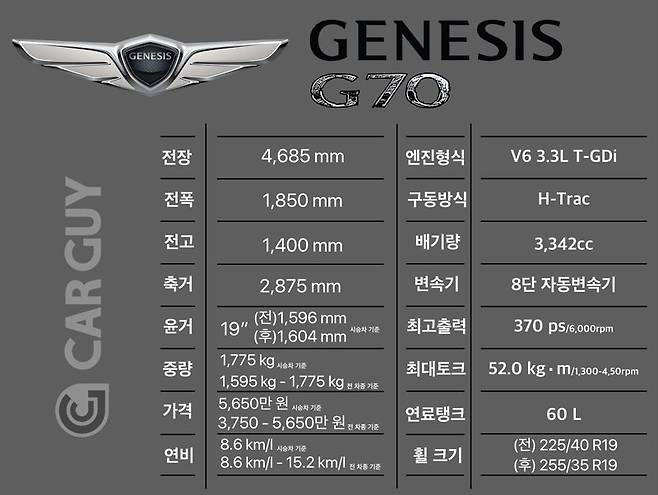 제네시스 G70은 G80보다 한 급 아래의 C 세그먼트 세단이다. 2.0L와 3.3L 터보 가솔린과 2.2L 디젤엔진 등 3가지 라인업을 갖추고 있다.