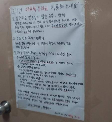 | 서울 A여자고등학교에서는 학교 측의 복장 단속에 반발하는 3학년 학생이 체육복 등하교를 요구하며 교내에 대자보를 붙였다. |