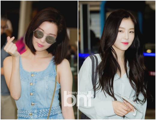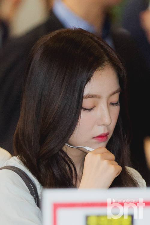 여권확인줄에 서서 기다리며 음악감상 중인 레드벨벳 아이린, 배주현. 살짝 감은 눈이 도도하면서도 참 예쁘네요.