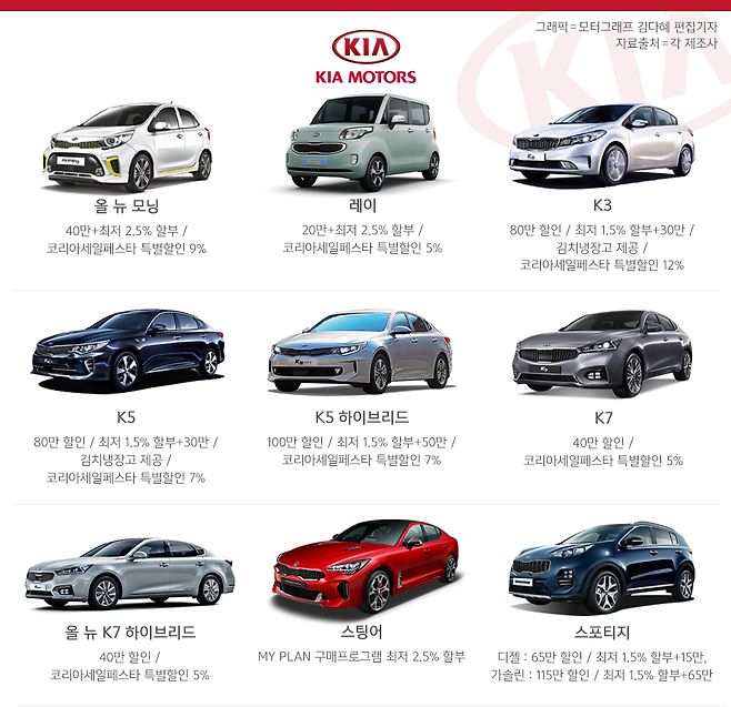 이외 신형 모닝은 최대 9% 할인 조건이 제시됐다. 반면, 인기 차종인 쏘렌토와 카니발 등은 이달에도 별다른 구매 혜택이 없다.