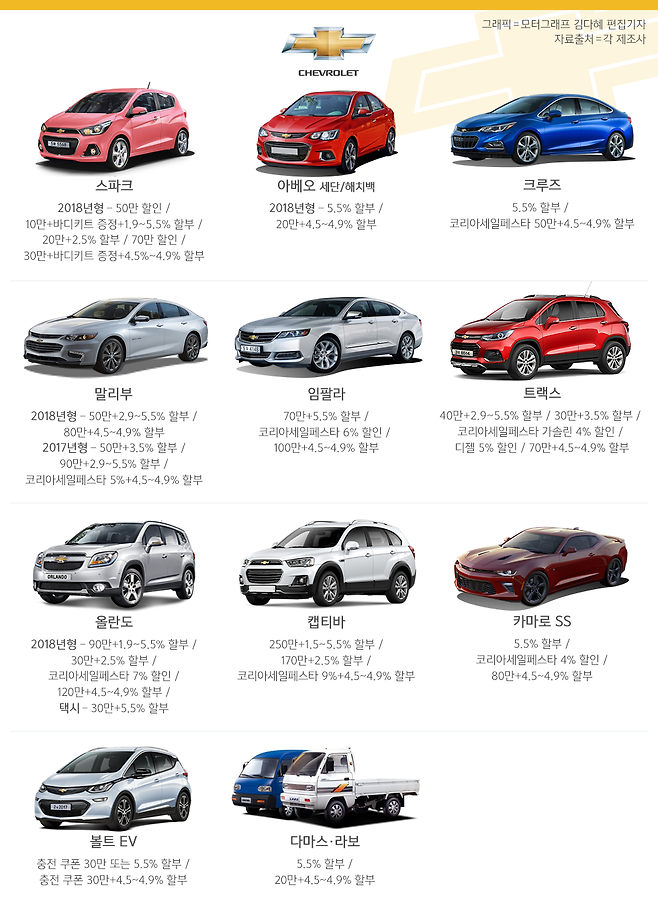 이어 차종별로 회사 출범 15주년을 기념해 특별 할인 조건을 내걸었다. 단, 아베오와 크루즈 등 일부 차종은 제외됐다.