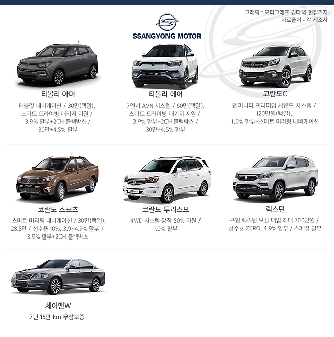 쌍용차는 기존에 보유한 RV를 ‘마이카 옥션’에 매각하고, G4 렉스턴으로 구매할 경우 최대 310만원 혜택을 제공한다. 더불어 출고한지 10년 이상 지난 구형 렉스턴을 보유하고 있는 고객에게는 최대 700만원을 보상해 주는 ‘렉스턴 매니아 보상 프로그램’도 새롭게 선보였다.