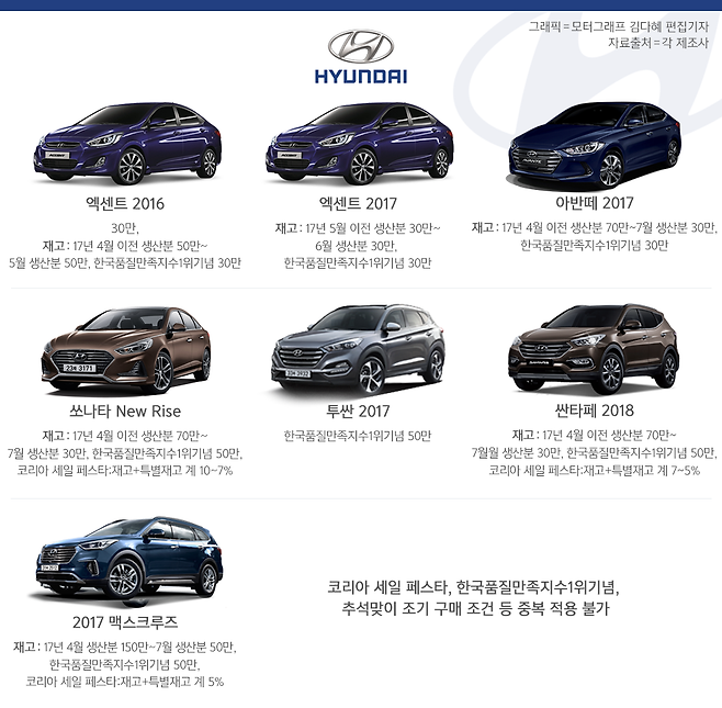 이와 별도로 현대차는 이달 신차 구매시 한국품질만족지수 1위 기념 혜택을 제공한다. 엑센트·아반떼는 30만원, 쏘나타·투싼·싼타페·맥스크루즈는 50만원이다. 단, 코리아 세일 페스타 등 여타 구매 혜택과 중복 적용은 불가하다.
