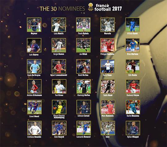 2017 발롱도르 후보 30인이 모두 발표됐다.
