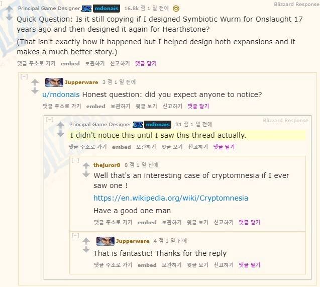 논란이 확산되자 당사자인 마이크 도내 블리자드 '하스스톤' 수석 디자이너가 직접 댓글을 남기기까지 했다. 그는 "내가 17년전에 '심바이오틱 웜'을 만들고 다시 '하스스톤'을 위해 다시 그것을 만들었다고 해도 복제라고 할 수 있겠냐"며 "레딧 글을 보기 전까지는 해당 사실에 대해 알지도 못했다"고 밝혔다.
