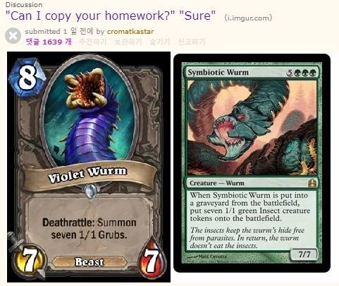 아이디 'cromatkastar' 이용자는 7일(미국 시각) 레딧 '하스스톤' 게시판에 '숙제를 베껴도 되지? 물론!' 이라는 제목의 글에 두 카드 이미지를 나란히 열거했다.