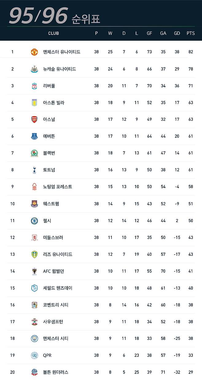 22개 팀으로 출범했던 프리미어리그가 이 시즌부터 20개팀으로 조정됐다.