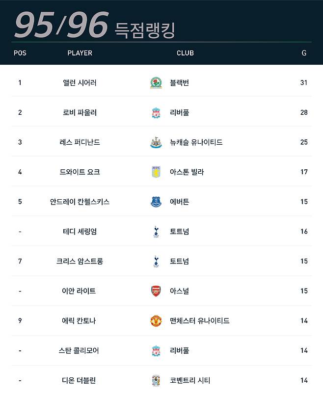 이 시즌, 블랙번은 지난 시즌의 리그 우승과는 거리가 먼 리그 7위로 시즌을 마감했지만, 앨런 시어러는 여전한 화력을 뽐냈다. 그의 31골 기록은 현재까지도 프리미어리그가 20개 팀으로 줄어든 이후 나온 최다골 기록으로 남아있다.(호날두, 수아레즈와 공동 1위)