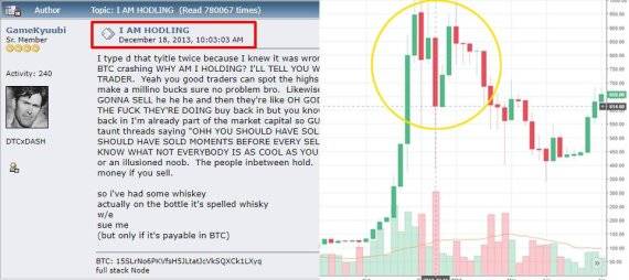 | ▲ (왼) 2013년 아이디 ‘GameKyuubi’가 술에 취해 글을 올린 'I AM HODLING'의 캡처 모습, (오) 당시 상황을 엿볼 수 있는 비트코인의 시세 차트 |