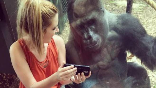 두꺼운 유리를 사이에 두었지만 이 고릴라는 흥미롭다는 듯 가까이 붙어 앉더니 코스텔로 씨의 스마트폰을 가만히 응시했습니다.