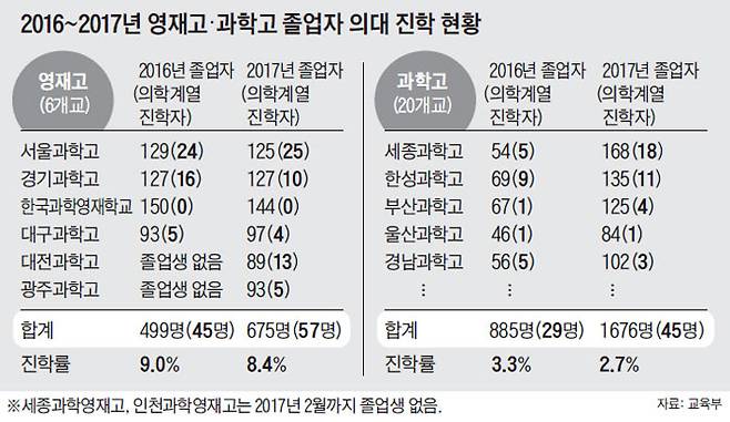 영재고 가운데 의대에 가장 많은 졸업생을 보낸 곳은 2009년 과학고에서 영재고로 전환한 서울과학고로, 지난해 졸업생(125명)의 20%(25명)가 의대에 갔다. 이 학교는 2013년부터 해마다 약 15~23%의 졸업생이 의학계열로 진학하고 있다. 경기과학고도 2016년 졸업생 12.5%, 지난해 졸업생의 7.8%가 의대에 갔다.