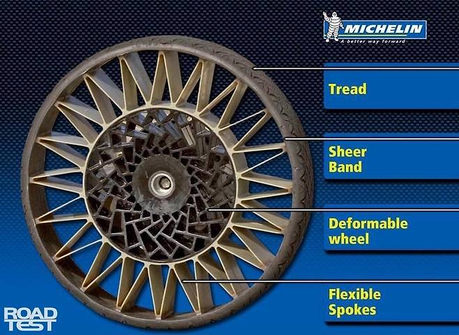 다만 타이어의 전체 구조를 딱딱하게 만들되, 지금 우리가 사용하는 공기주입형 타이어와 동일한 수준의 충격 흡수력을 제공해야 한다. 주행 중 타이어는 다양하게 변형된다. 예를 들면 급격한 코너링에는 옆면 일부를 사용한다. 따라서 공기없는 에어리스 타이어가 자연스레 주행에 맞춰 변형할 수 있도록 만드는 쪽이 중요하다. 단단하되 지나치게 단단할 필요는 없다. 연비를 위해 타이어 기술이 바뀐다 하더라도 승차감 및 주행 성능을 개선하는 쪽도 중요하다.