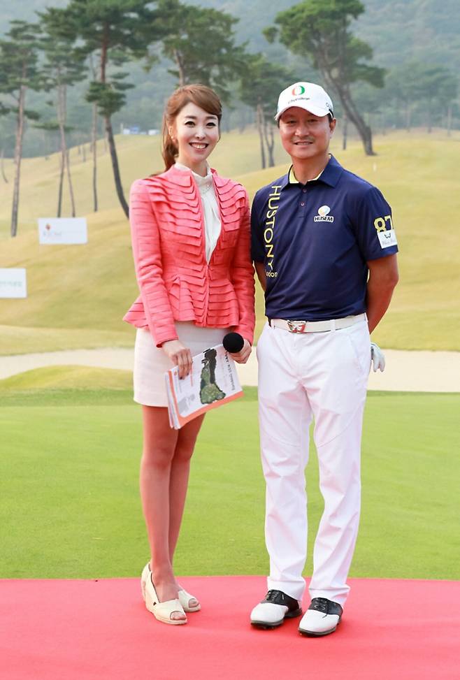 '골프여신' 김미영 아나운서가 지난달 29일 경남 김해에서 막을 내린 한국프로골프(KPGA) 코리안투어 현대해상 최경주 인비테이셔널에서 우승자인 황인춘 프로와 기념촬영을 하고 있다.