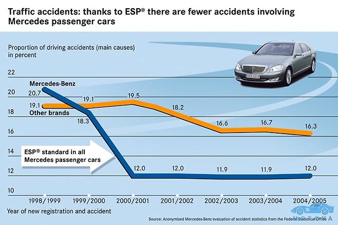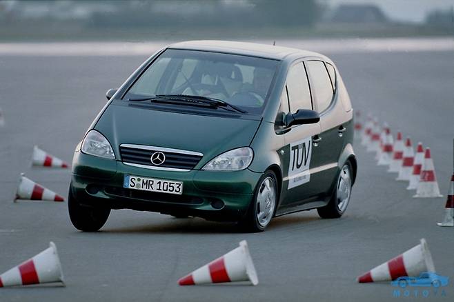 하지만 이러한 방침은 2년 뒤에 출시한 새로운 소형차 때문에 뒤집어지게 된다. 1997년 출시한 메르세데스-벤츠의 첫 소형 승용차 모델인 초대 A클래스가 엘크 테스트(야생동물 출현을 상정한 긴급 회피 테스트) 중 전복되는 사고가 일어난 것이다. 메르세데스-벤츠는 A클래스의 약점을 보완하기 위해 서스펜션을 보강하고 보다 정밀한 제어 시스템을 갖춘 차체 자세 제어 장치를 전 모델에 기본 적용했다. 또한, 이미 판매된 약 3천여대의 A클래스를 리콜하여 자세제어 장치 설치와 서스펜션을 보강하는 조치를 취했다.