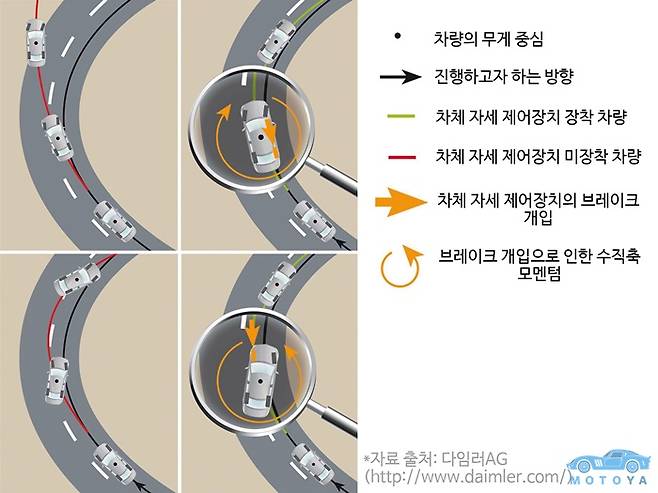 2015년을 기하여 대한민국에 출시되는 모든 자동차(일부 제외)들은 타이어 공기압 모니터링 시스템(TPMS) 함께 ‘차체 자세 제어 장치’의 설치가 전면 의무화되었다. 차체 자세 제어 장치는 주행 중인 자동차가 미끄러지는 것을 방지하고 안정적인 주행을 돕기 위한 장비다. 특히, 위와 같이 자동차가 원하는 방향으로 진행하지 못하는 상황에서 상실한 제어력을 회복하는 데 있어 중요한 역할을 담당한다.
