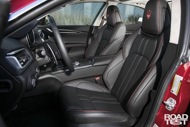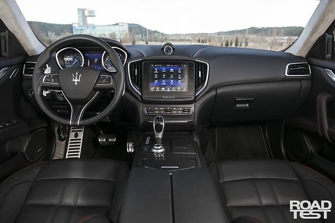 반면, 기블리의 속살은 운전대부터 남다르다. 스티어링 휠 뒤쪽에 자리한 서슬 퍼런 패들 시프터부터 주무르고 싶다. 전통적인 아날로그 계기판과 두툼한 기어레버, 스웨이드로 치장한 천장 등 ‘남자다움’이 물씬하다. 그렇다고 디지털과 담 쌓은 건 아니다. 8.4인치 멀티 터치스크린을 중앙에 심고 아래에 공조장치 버튼을 옹기종기 모아 놨다.
