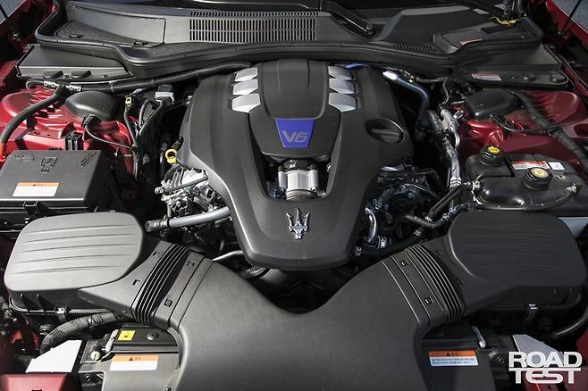 기블리 S Q4의 보닛 속엔 V6 3.0L(2,979cc) 가솔린 트윈터보 엔진이 뱀처럼 똬리를 틀었다. 좌우로 구불구불 펼친 흡기관과 시뻘건 엔진 커버 등 볼거리가 풍성하다. 이 엔진은 미국 크라이슬러의 인디애나 코코모 캐스팅 공장에서 알루미늄으로 빚은 V6 엔진 블록을 가져와 페라리 이탈리아 마라넬로 공장에서 완성한다.