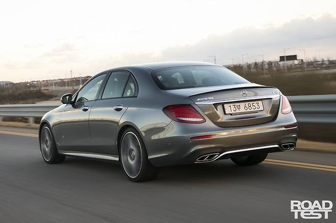 시속 40→100㎞ 추월가속 테스트 결과도 흥미롭다. AMG E 43 4매틱은 4단에서 순식간에 2단을 내려 물고 3,000rpm부터 맹렬하게 가속한다. 그러나 정지가속 테스트와 다르게 다소 굼뜬 반응이 산통을 깼다. 변속기와 엔진 모두 크게 한 번 숨을 고른 뒤 속도를 붙였다. 터보차저 특유의 지연 현상도 유독 눈에 띄었다.