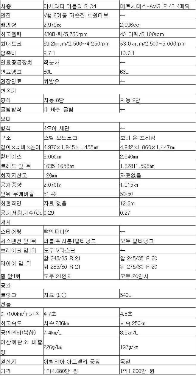 기블리 S Q4와 AMG E 43 4매틱. 이탈리아와 독일 출신의 두 맞수를 저울질했다. 두 차는 서로 닮은 듯 다른 모습으로 각자의 매력을 어필했다. 메르세데스-AMG E 43 4매틱은 전 과목에서 1등급 받은 모범생처럼, 모든 분야에서 평균 이상의 능력을 뽐냈다. 하지만 고성능 세단에게 기대할 수 있는 감성적인 요소를 잃은 느낌이다.